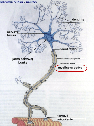 Obrázok nervu a myelínového obalu (červeným), ktorý chráni a vyživuje jeho nervové vlákno, aby správne fungoval