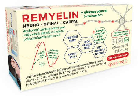 REMYELIN cielene prispieva k obnove myelínového obalu nervov, vyživuje nervy a znižuje riziko šírenia mikrozápalu v nervových obaloch. Toto všetko, a naviac v kombinácii s dlhodobo zvýšeným krvným cukrom, sú faktory zodpovedné za rozvoj diabetickej nohy, resp. polyneuropatie u diabetikov.
