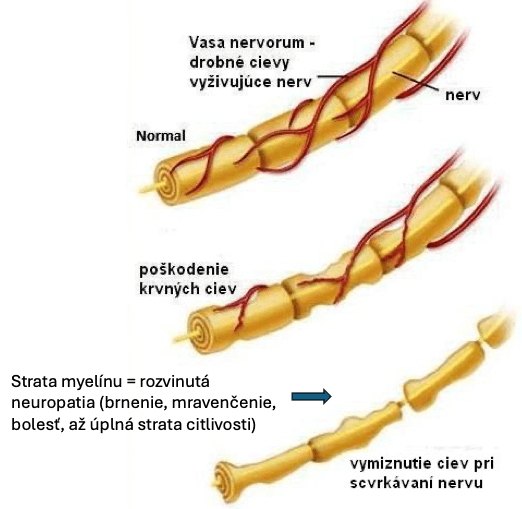 Názorné zobrazenie postupnej straty myelínového obalu nervu dlhodobým pôsobením zvýšenej hladiny cukru v krvi a vzniku polyneuropatie