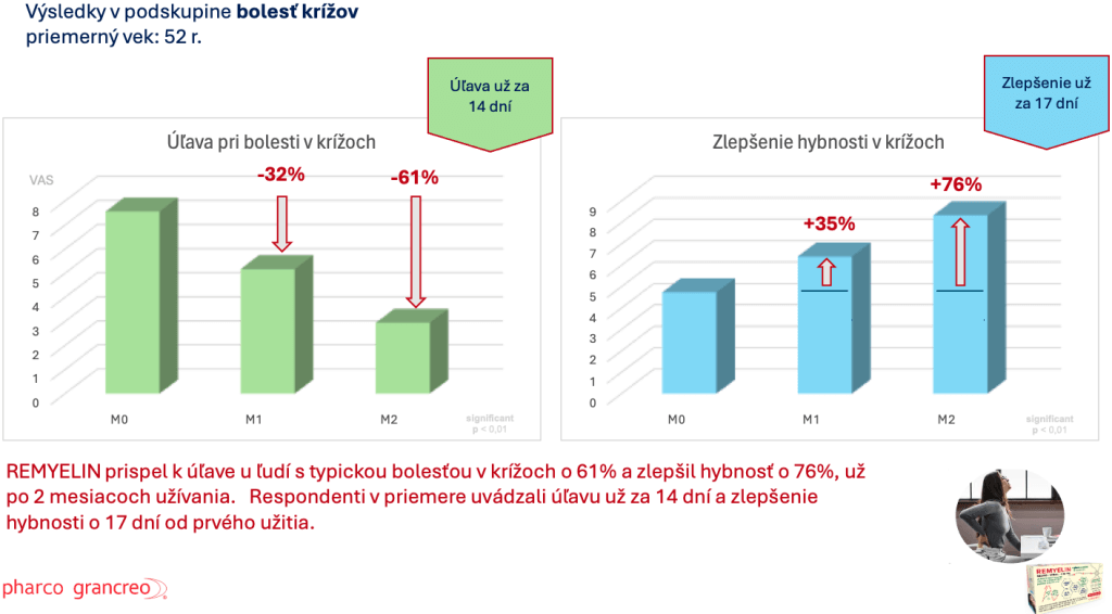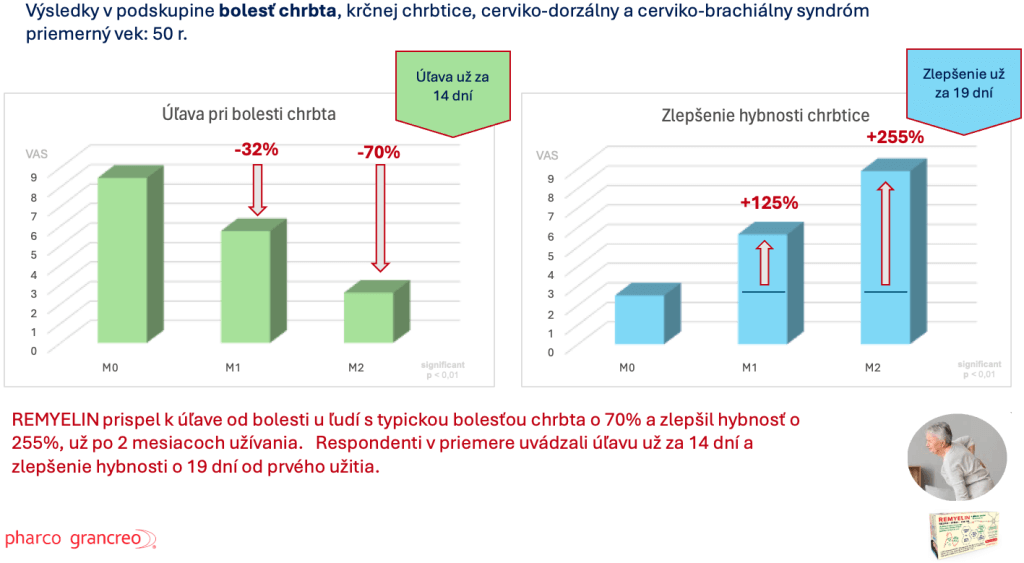 Klinické skúšanie v SR v roku 2024 s produktom REMYELIN prebiehalo v 17-tich ambulanciach (až 11 z nich neurologických) na skupine takmer 90-tich ľudí po dobu 2 mesiacov. Preukázalo skutočnú úľavu pri bolestiach chrbta a v krížoch, a tiež zlepšenie pohyblivosti chrbtice a v krížoch.