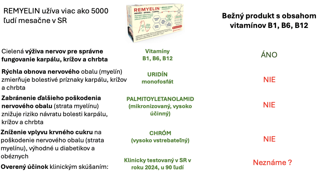 Porovnanie rozdielov produktu REMYELIN a bežných produktov s obsahom vitamínov B určených pri bolestiach krížov, chrbta a krčnej chrbtice