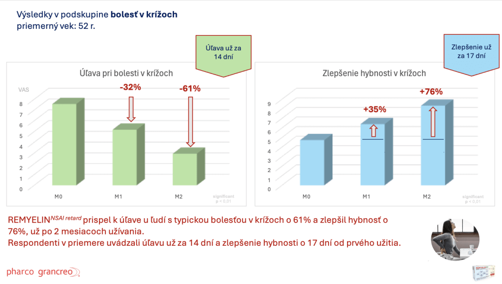Klinické skúšanie v SR v roku 2024 s produktom REMYELIN NSAI prebiehalo v 17-tich ambulanciách (až 11 z nich neurologických) na skupine takmer 90-tich ľudí po dobu 2 mesiacov. Preukázalo skutočnú úľavu pri bolestiach chrbta a v krížoch, a tiež zlepšenie pohyblivosti chrbtice a v krížoch (pozri graf dolu). Respondenti uvádzali úľavu od bolesti už za 14 dní od začatia jeho užívania.