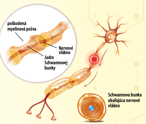 Nerv, ktorý stráca myelínový obal, nemôže správne fungovať, začne bolieť. Dochádza k obnaženiu a dráždeniu nervového vláka okolitým tkanivom, aj nedostatočnej výžive. Môžeme si to predstaviť ako anténny TV kábel. Ten je vo vnútri tiež chránený mriežkou, aby nedošlo k rušenie TV signálu. Ak je však kábel niekde poškodený a chýba v tom mieste ochranná mriežka, obraz začne zrnieť a šumieť.