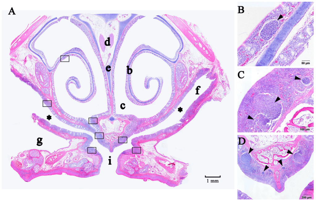 Mikroskopický rez nosovou dutinou (obr. A) s prítomnou sliznicou. Na obrázkoch B, C, D, šípky ukazujú na MALT zhluky (pevnosti) plné imunitných lymfocytov