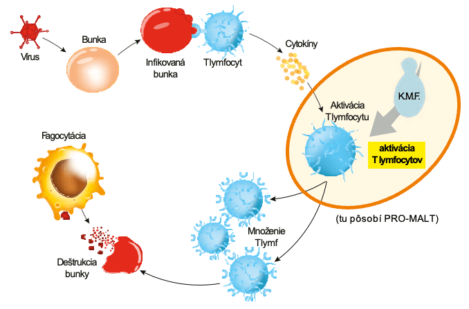 Množenie a dozrievanie lymfocytov vďaka špeciálnemu zloženiu PRO-MALT. Tie následne efektívne likvidujú vírusom postihnuté bunky