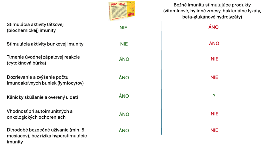 Porovnanie rozdieľov účinku bežných imunitu stimulujúcich produktov a produktu PRO-MALT