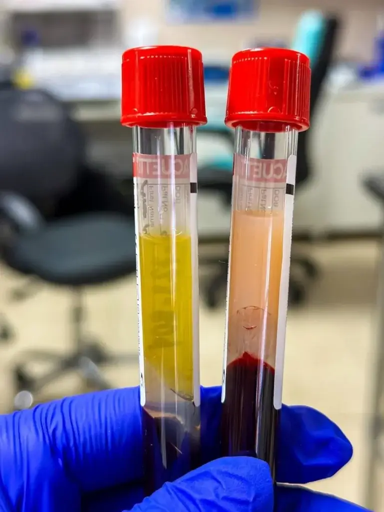 Porovnanie normálnej krvi a chylóznej krvi (vpravo)